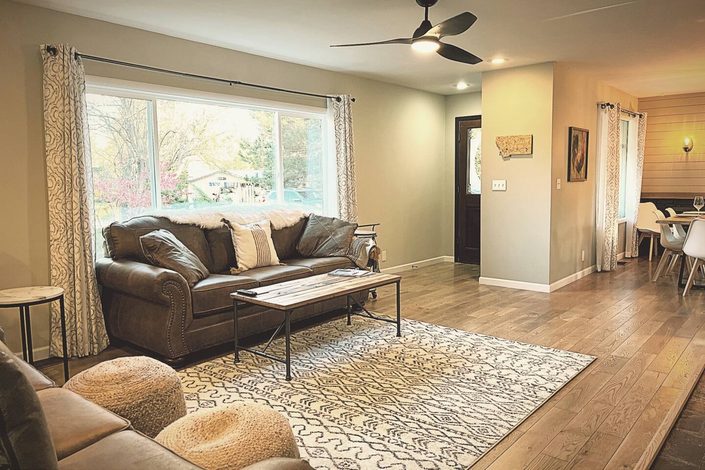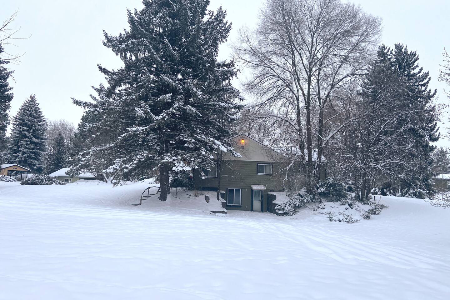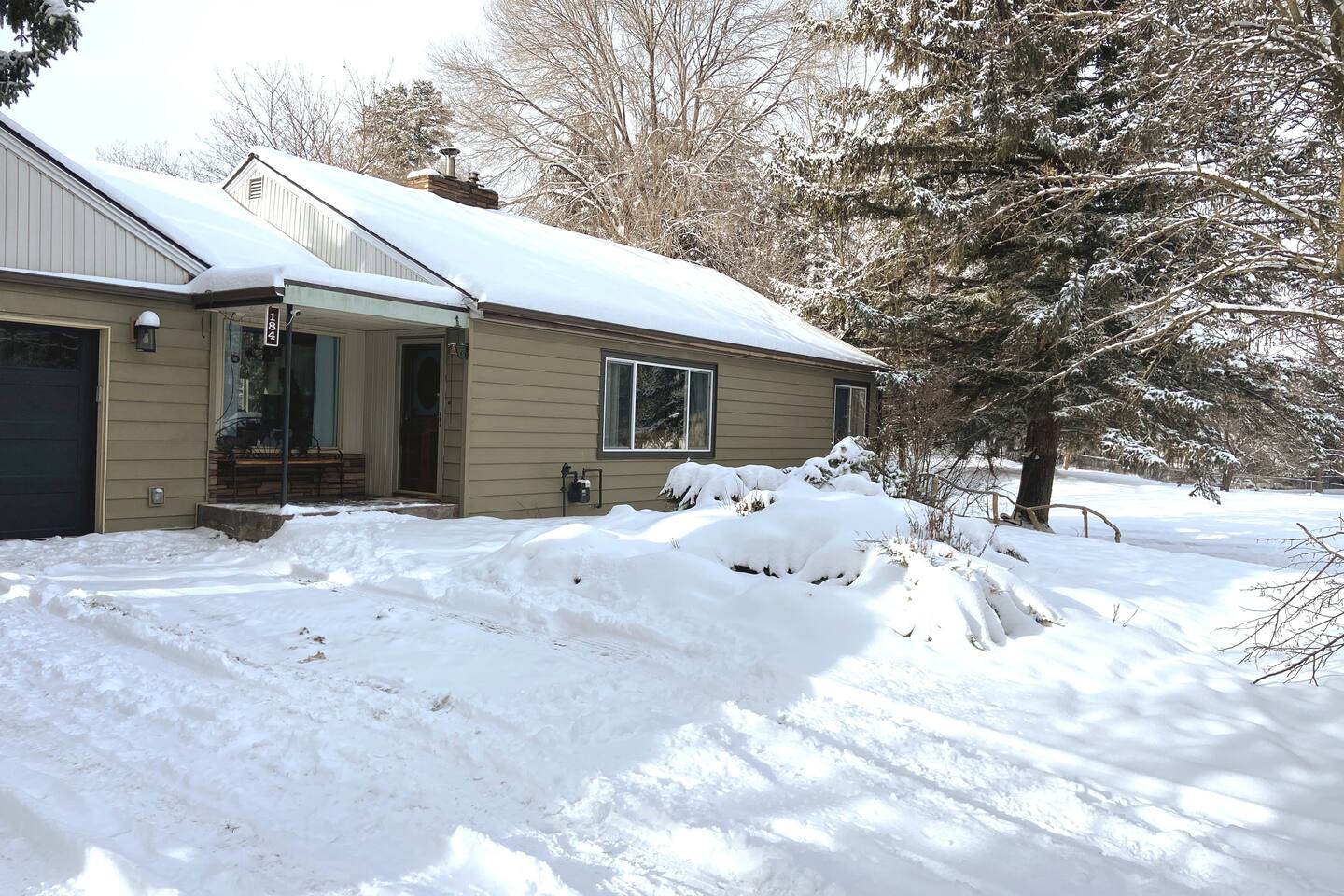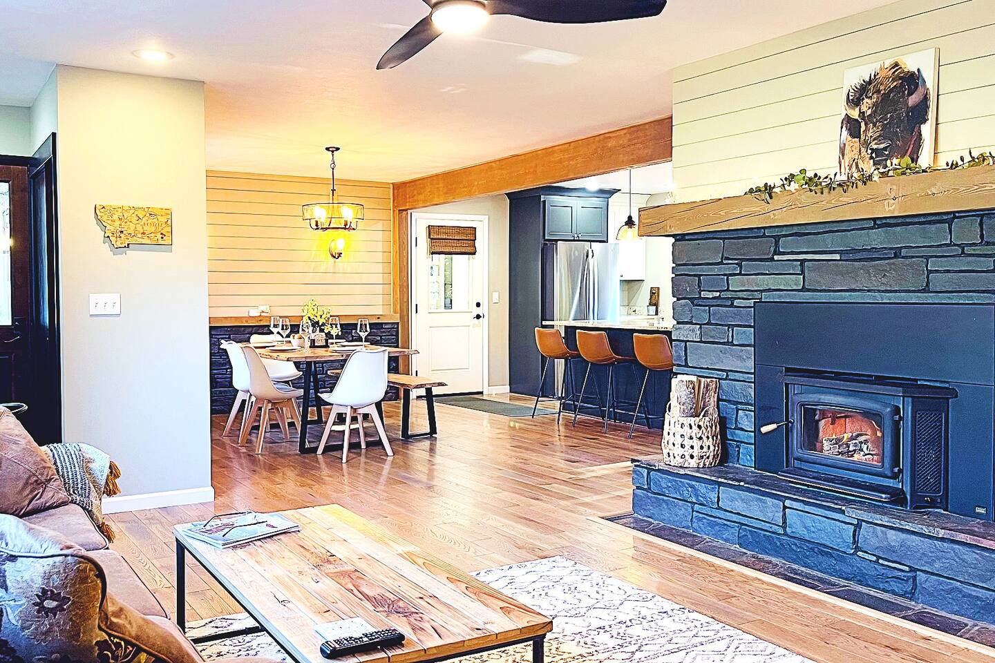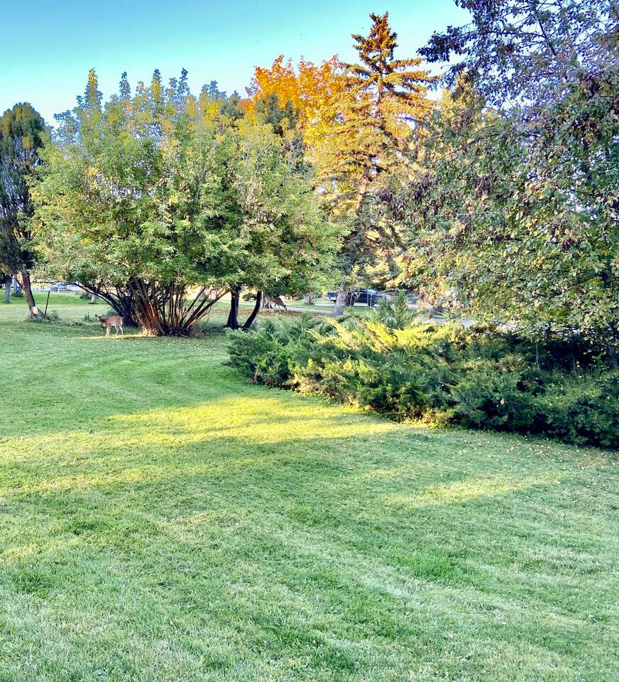 This home sits on a large 1.5 acres of private land. It is surrounded by a lush green lawn in the summer or a snowy winter wonderland in the winter. We even have our own resident deer family (please do not attempt to touch or feed them) too! Large home in the heart of Kalispell, only minutes away from downtown shopping, restaurants, bakeries, coffee shops and breweries. The main room features plenty of space for your family to gather, a large wood-burning fireplace, and a floor-to-ceiling picture window showcasing the beautiful views. The Home's Sleeping Arrangements: • Bedroom #1 - 1 King bed • Bedroom #2 - 1 Queen bed • Bedroom #3 - 2 single beds • Living Room - 1 Sofa Bed ** You can also rent this home (when owners are not using the downstairs guest house) as a 2 Story, 4 bedroom (7 beds) , 3 Bathrooms, 2 kitchens, and 2 Living rooms home at: airbnb dot com /h/glacierhomebase The open floor plan leads you from the living space into the dining area comfortably seating 6 and a 3-person kitchen island. The roomy kitchen is highlighted by the gas range and oven, large refrigerator, and microwave. After a long day of skiing at Whitesh Ski Resort stretch out beside a roaring fire, put your feet up, and tell stories from an exciting day. Central Location: Downtown Kalispell is walking distance, the ski resort is 23 miles, the town of Whitefish is 15 miles away, and Glacier National Park is 32 miles away. Professionally cleaned: Our cleaners have been trained in proper disinfection techniques and will deep clean the home before and after your stay. Centrally Located: • Historic Downtown Kalispell is within a short walking distance (less than 1 mile to many shops and eateries) • Flathead Lake is 10 miles away • Walk just 1/2 mile to Historic Conrad Mansion • Whitefish Ski Resort (Big Mountain) is 23 miles • Blacktail Ski Resort is 29 Miles • the Historic town of Whitefish is 15 miles away • Glacier Natl Park is 32 miles away At the end of a day on the hill, take off your gear and treat yourself to a a a hot chocolate on the comfy couch. In warmer months, make dinner on the barbecue and gather at the al-fresco dining area on the private patio in colder weather, everyone can cozy up to the fireplace inside. This home is perfect for two families with kids or a fun friendly getaway. After a day of skiing, warm up and relax by the fire for a fun, entertaining movie night. We worked hard for this little place in paradise and are sharing it at a reasonable price for guests. Your winter base-camp for everything Glacier country has to offer! This home is perfect for multiple families with kids or a fun friendly getaway. you will love being so close to Whitefish Ski Resort, Nordic Skiing, Sledding, Flathead Lake, Downtown Whitefish, Glacier National Park, and downtown Kalispell! The private home is situated in a quiet, family-friendly, neighborhood surrounded by tall pine trees and a LARGE surrounding yard. Location, location, location! The cozy 3 bedroom unit is located close to historic downtown Kalispell. Enter into a relaxing living space with plenty of couch space & cable TV. A fully stocked kitchen awaits for preparing meals Heated garage with boot dryer - the perfect place to dry your gear after a fun day skiing and playing in the snow! Parking - There is plenty of room for parking in the driveway (3 cars) and 1 space available for guests to park a car in the garage. Owners' car is stored in the other space in garage. Self-Check-ins - With self-check-in you won’t need to interact with anyone face-to-face. You have full access to home except for the owner's vacation unit downstairs. 1 space in the garage is for guests as well as the entire driveway, the owners of the home store a car in the other garage parking space. Sleeping Arrangements are: a king in the master, a queen in the 2nd bedroom, and two extra-long twin beds in the 3rd bedroom, and a sofa sleeper in the family room. Perfect for couples or medium-sized families. It's a quick walk to the historic downtown Kalispell, or a quick drive down to the Whitefish village, restaurants, bars, and nightlife. Either way, you are only minutes from all that Flathead County has to offer! When you book, we’ll send a link to our personal recommendation guide to help you plan your stay and make your trip amazing! We do not issue REFUNDS due to weather, air-quality (AQI), or driving conditions. Please purchase Trip Insurance that will cover such events. We like "Insure My Trip". A place to work or have meetings - This is the perfect place to come and enjoy everything the area of Kalispell/Whitefish/Glacier Natl Park has to offer. Is your office closed? If you’re unable to go into the office, our home is equipped with high-speed WiFi and has plenty of room for you to work comfortably. On warm evenings, you may spend most of your time on the private patio with wooded views. Retreat to the living room when it gets chilly and warm up by the fireplace. Relax on the roomy sofas and search through hundreds of options with the flat-screen TV. Or use the WiFi on your laptop to catch up on local news or to check out reviews of local restaurants. The adjacent dining room makes for a comfortable spot to gather for dinner, or grab a seat at the kitchen island for a quick breakfast. The kitchen will make cooking a breeze, as it is fully equipped and ready for family meals. • This rental is located in a residential neighborhood. Loud parties and disruptive behavior are not tolerated. This neighborhood is monitored by a 24/7 call service. • Quiet hours are 9pm-8am We expect that you respect the home as much as we do, and trust that you will leave it clean, less the towels and linens. Full access to home except for owner's vacation unit downstairs (sometimes owners will be in downstairs unit, you will have a completely private stay and will not be sharing any space with them except the garage. 1 space in the garage, the owners of the home s